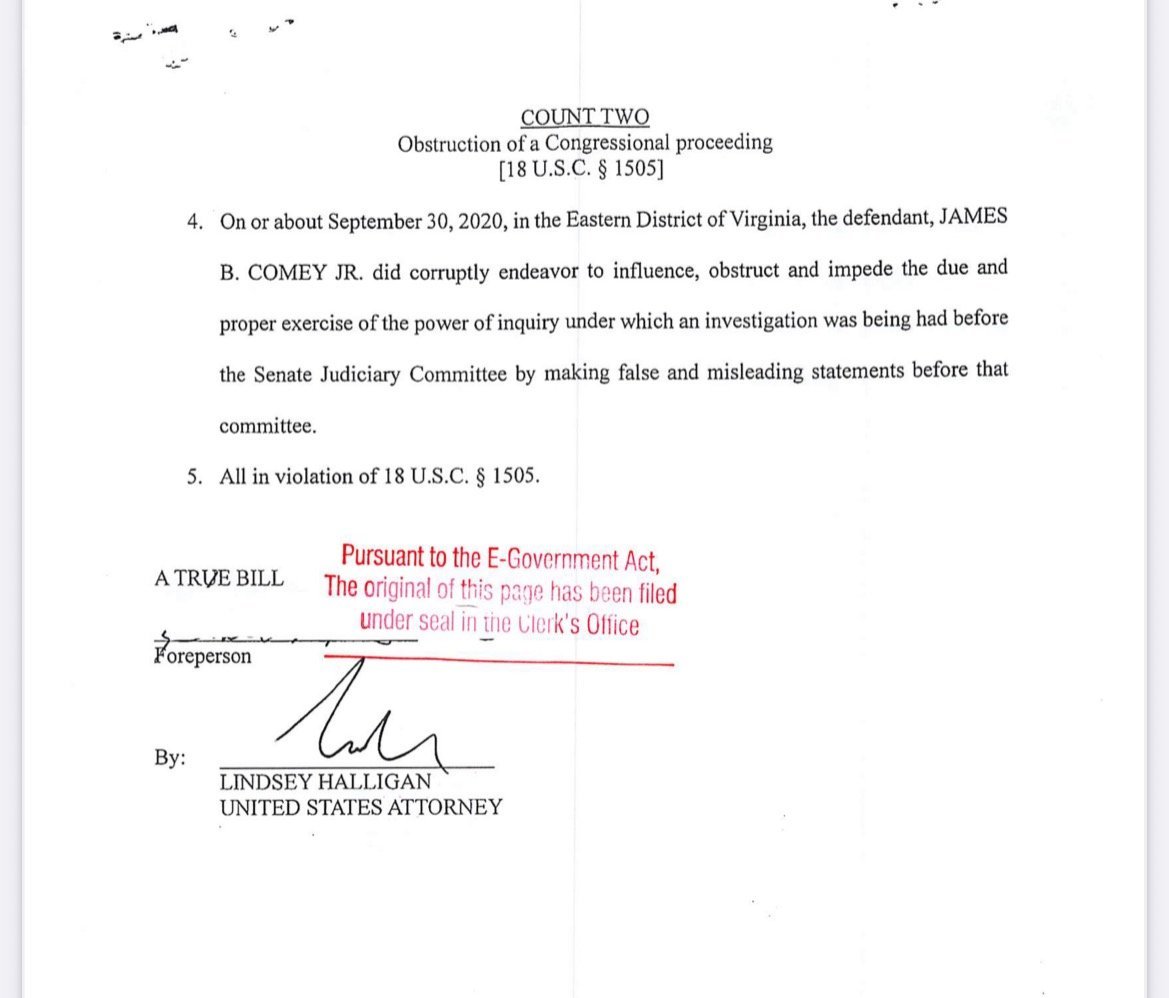 Former FBI Director James Comey was indicted on two counts by a grand jury in the Eastern District of Virginia – false statements and obstruction of justice.