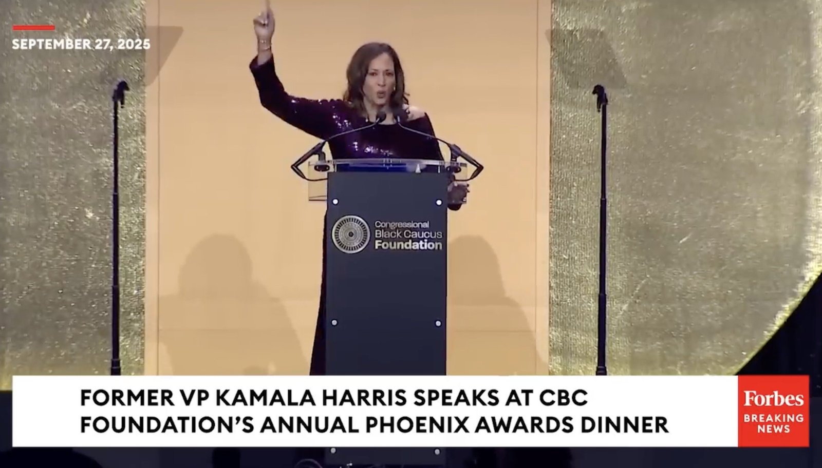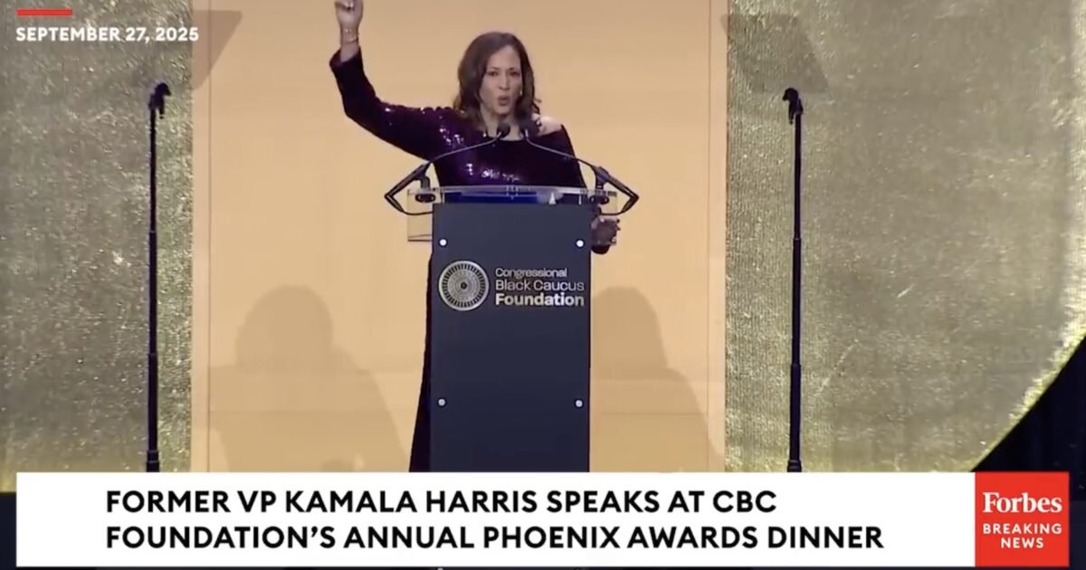 Kamala Harris riles up the crowd at the Congressional Black Caucus Foundation’s Annual Phoenix Awards Dinner in Washington, D.C., on September 27, 2025.