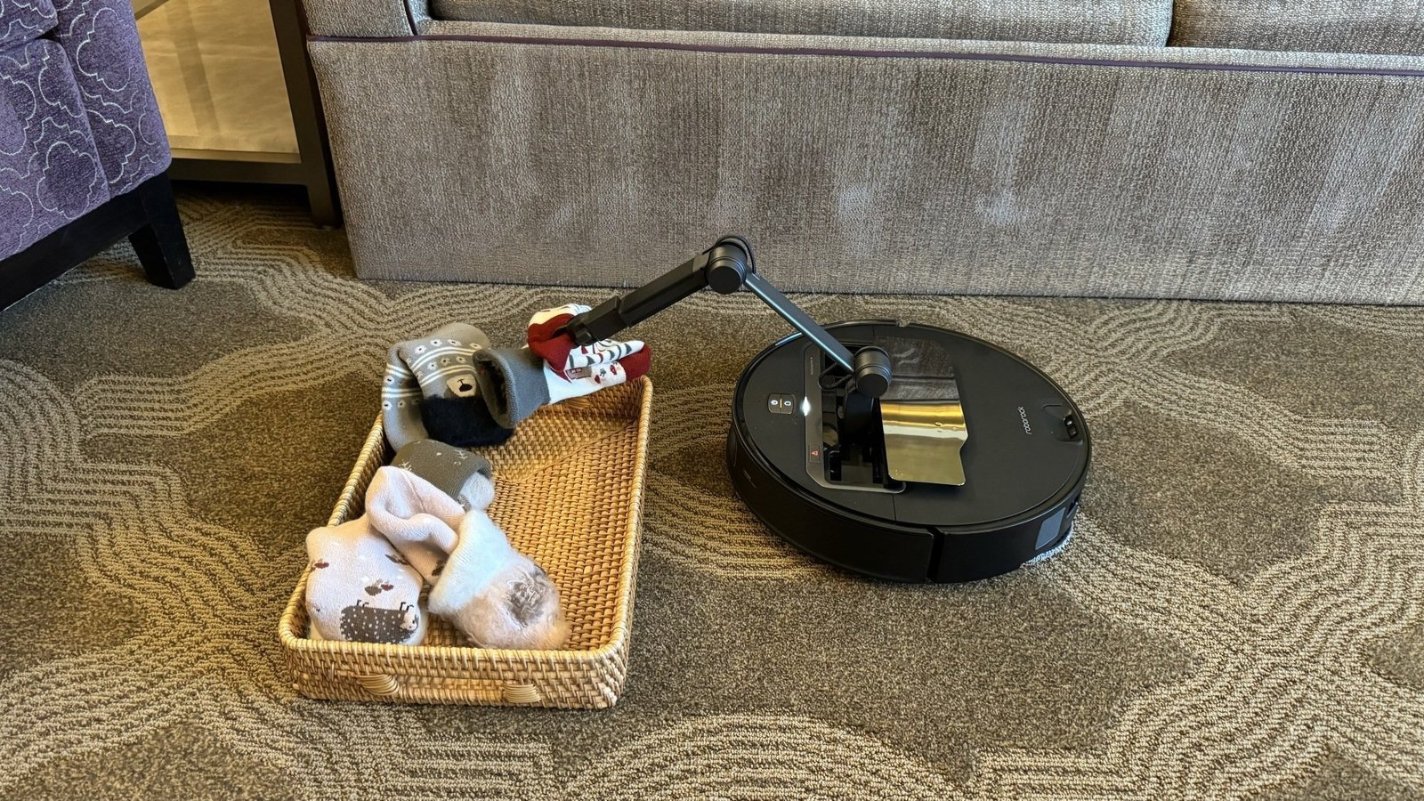 I have since had the Saros Z70 in my home for several months, and was disappointed (but not surprised) that the robotic arm doesn't make your life much easier. The arm's pickup capabilities were advertised to cover four different types of obstacles and must weigh under 300 grams: socks, paper, small towels, and lightweight shoes (no pet toys yet). The arm does technically work sometimes — I've witnessed it successfully pick up sandals and socks — but other times, it completely misses or ignores obstacles altogether. The half-baked innovation had good intentions, but for now, is just another robot vacuum that is trying to do too much.
